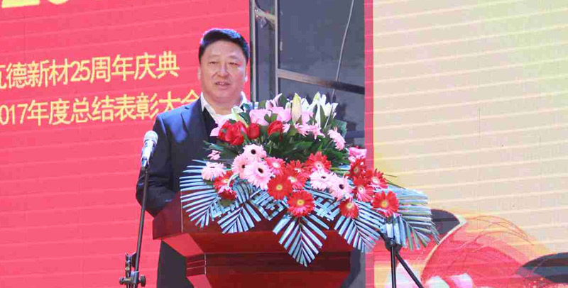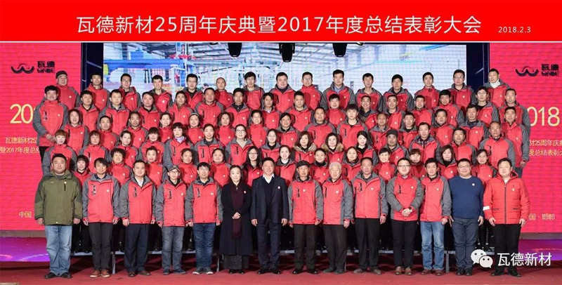 2月3日上午瓦德新材25周年慶典暨2017年度總結表彰大會于河北邯鄲五谷豐登大酒店隆重召開。此次會議的主題為“感恩 共享 發(fā)展”。集團董事長謝富強,總經(jīng)理常金秀,中高層領導干部,武漢工廠、邯鄲工廠、安徽工廠職工代表,社會各界友人等近300人歡聚一堂, 共同分享收獲的喜悅,迎接全新的挑戰(zhàn)。